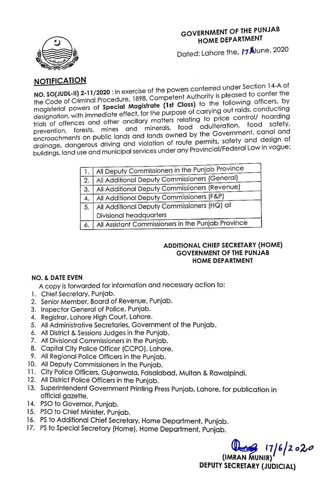 لاہور. پنجاب حکومت نے ڈپٹی کمشنرز. ایڈیشنل ڈپٹی کمشنرز اور اسسٹنٹ کمشنرز کو سپیشل مجسٹریٹ کے اختیارات دے دیے. نوٹیفکیشن جاری کر دیا گیا.